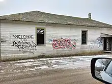 "Welcome to Abandoned Paradise!" graffitio on the main razed building