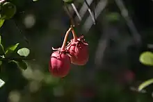 Its fragrant white, unisexual flower clusters grow in the axils of leaves on lateral shoots resembling spines. Dusky-pink, pear-shaped, pendulous fruits are about 15mm in length and the same in diameter, dehiscing along three longitudinal lines to produce 3 valves curling back from the distal end to reveal orange arils enclosing the seeds. Leaves are alternate or tufted, hairless, leathery, 25-50mm long, with slightly serrate margins, ovate to round in shape, glossy and dark green above, paler beneath, emarginate to acute, depressed apex. Branchlets are spiny and densely spotted with pale lenticels.[3][4] Larvae of the African moth Drepanogynis cambogiaria (Guenée, 1858) feed on this species and on other members of the Celastraceae.[5] This is one of the species frequently browsed by Black Rhino in the Hluhluwe–iMfolozi Park.[6]