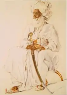 Finally, in 1838, Mir Bahram Khan visited Lahore with 12,000 Mazari tribesmen and officials on the invitation of the Maharaja Ranjit Singh. The Mazari were well received by the Maharaja at the Lahore Fort and given a royal welcome. The Maharaja had the Mughal-era Naulakha Pavilion (Saman Burj) inside the Lahore Fort specially renovated for the month-long stay of Sardar Mir Bahram Khan Mazari. This meeting between the two leaders officially brought an end to the long war between the Mazari Baloch and the Sikh Empire that started with the attack on Mithankot. This picture of Mir Bahram Khan Mazari is in the Sikh War Gallery in Amritsar, India, and was painted by the personal French artist of Maharaja Ranjit Singh's court when Mir Bahram Khan Mazari visited Lahore.[2]