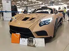 The Evantra Millecavalli was unveiled at the 2013 Top Marques Show in Monaco.[18] The 7.0L LS7 found in the 771 has been enlarged to 7.2L, and fitted with a pair of turbochargers, and now produces 1,000 PS (986 hp; 735 kW), hence the name, with Mille meaning thousand & cavalli meaning horses.[18] Sending that 1,000 PS and 1,200 N⋅m (885 lb⋅ft) to the rear wheels is a bespoke 6-speed sequential, which gives the car a claimed 0–97 km/h (0–60 mph) acceleration time of 2.7 second, and an estimated top speed of 402 km/h (250 mph). Again, OZ Racing supplies the wheels which are the same size as the 771 wheels, and are shod with Pirelli Trofeo R tyres, 265/35R19 at the front and 335/30R20 at the rear.[19] Stopping power is provided by 390 mm (15 in) rotors and six-piston calipers at the front, and 360 mm (14 in) rotors and four-piston calipers at the rear, with carbon-ceramic brakes being standard.[20] Mazzanti claims that this can bring the car from 300 km/h (186 mph) to a stop in 7 seconds.[21]