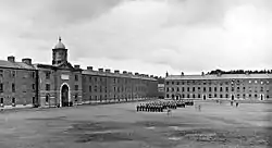 Prior to Irish independence, the installation was known as Richmond Barracks, after the area of the town in which it is located. The 17-acre site for Richmond Barracks was donated to the Crown by a local landlord, Sir John Craven Carden, 1st Baronet, in September 1808.[2][3] Its long story began when the British administration decided that yet another barracks was required in County Tipperary. The first site selected was in Thurles beside the River Suir. However, as that site was adjacent to the Convent of the Ursuline Nuns, the nuns successfully objected to a military barracks so near to their foundation. As a result, the War Office decided to build the installation in Templemore instead.[2]