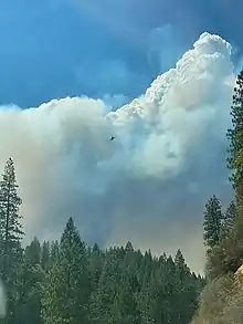 By August 4, the fire continued to grow, fueled by dry vegetation. The southern part of the fire began burning towards the August Complex fire.[11] On August 5, the Platina area was placed under evacuation warning.[1] Smoke from the fire was carried into the Sacramento Valley and San Francisco Bay Area starting July 6.[12] Six handcrew members were injured while working a spot fire on August 6, sustaining burns.[3] On August 7, it was confirmed that the fire had destroyed four structures. The fire started spreading southeast, burning on the north slope of North Star Mountain. Heavy smoke from the fire caused air support to be suspended.[2] That same day, the Forest Service announced that portions of Shasta-Trinity National Forest would be closed through October.[13]