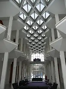 The McGregor Memorial Conference Center is a two-story symmetrical pavilion covered with travertine marble.[6] It sits on a podium faced with Mankato stone, with integral reflecting pool and sunken garden wrapping around the building on two sides.[6][7] The building exhibits a triangular design motif on the outside and inside. Inside, a skylit entry hall, dividing the interior space in two, is flanked by two levels of conference rooms.[6] The McGregor Center contains 11 meeting rooms, a 600-seat auditorium, a 2,500 sq ft (230 m2) reception area, and a 3,500 sq ft (330 m2) exhibit space.[4] The conference rooms can be combined to accommodate groups of various sizes.[7] Interior design features white marble floors, red carpeting, and black leather chairs by Mies van der Rohe.[7]