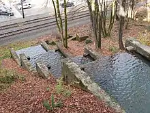 The north end of the pathway adjoins the Grand Staircase, which was constructed along Singer Hill Trail, a route used by these indigenous peoples as they traveled to and from the Willamette River.[14][15] One flight down, the staircase veers two opposing directions. The east leg turns towards an illuminated pedestrian underpass, after which that direction of the staircase rises two flights to the McLoughlin House historic site.[13] On the west side of this juncture, Singer Creek is channeled through the staircase to the man-made Singer Creek Falls designed by Franzen. The water flows over 20-foot (6 m) wide concrete slabs, down the bluff towards the river.[16] The west leg of the staircase leads towards city sidewalks and the municipal elevator.[13][17]