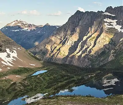 Mt. Vaught (left), Mt. Cannon (right), McPartland Mountain is the small knob between those two. Hidden Lake at bottom of frame.