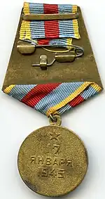 The Medal "For the Liberation of Warsaw" (Russian: Медаль «За освобождение Варшавы») was a World War II campaign medal of the military established on June 9, 1945 by decree of the Presidium of the Supreme Soviet of the USSR[1] to satisfy the petition of the People's Commissariat for Defence of the Soviet Union.