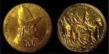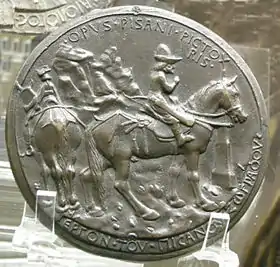 The medal of John VIII Palaeologus is a portrait medal by the Italian Renaissance artist Pisanello. It is generally considered to be the first portrait medal of the Renaissance.[1][2][3] On the obverse of the medal is a profile portrait of the penultimate Byzantine emperor, John VIII Palaeologus; the reverse contains an image of the emperor on horseback before a wayside cross. Although the date of the work is not clear it was likely to have been some time during 1438 and 1439, the years John was in Italy attending the Council of Ferrara (later moved to Florence). It is not known whether the emperor himself or his Italian hosts commissioned Pisanello to make the medal, but Leonello d’Este, the heir apparent to the marquisate of Ferrara, has been suggested as the most likely candidate.[4] Several drawings by Pisanello are closely associated with the medal and these include sketches now held in Paris and Chicago.