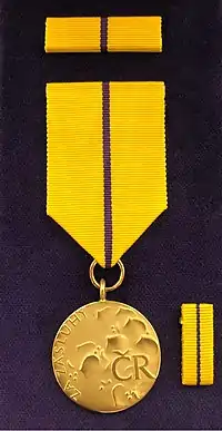 The Medal of Merit was originally created by the Parliament of the Czechoslovak Federative Republic in 1990.[2] However, no one was awarded the medal prior to its reauthorization by the Parliament of the Czech Republic.[3]