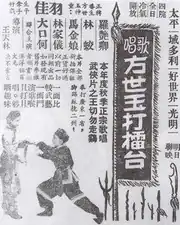 - Ge Chang Fang Shi-Yu Da Lei Tai (歌唱方世玉打擂台 – Fong Sai-Yuk Challenges the Boxing-stage Champion) (1952). This was a black and white cantonese film about Shaolin Master Fong Sai-Yuk and his fight with a lei tai champion.[9]