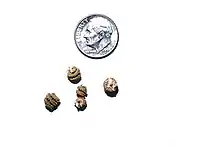 | Seed pods of Medicago noeana next to a U.S. dime for scale. | |