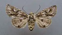Forewing whitish grey, speckled with darker scales, the shadings olive brownish, this colour filling up the outer half of median area between subcostal vein and submedian fold; a thick dark streak from base below cell; inner line double, oblique and angulated, darker externally; outer line lunulate-dentate, double; stigmata all large, rounded, pale grey with darker dusting, the reniform externally white, with a black line along its base above the median. vein; veins towards termen black-dotted, the intervals on margin with redbrown dentate markings, the submarginal line with a rufous dentate shade before it, crossed by a diffuse dark shade on submedian fold; hindwing pale and darker grey; a large cell blotch and blotch at margin on submedian fold blackish; an obscure darker outer line; marginal area pale grey. Larva brown, darker in front; dorsal line narrow, pale, with 4 white tubercles on each side; lateral lines waved, darkedged above, paler below; 11th segment with a two-pointed hump.[4] The wingspan is 50–58 mm.