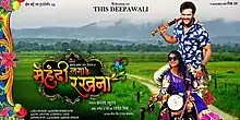 Mehandi Laga Ke Rakhna is a 2017 Indian Bhojpuri-language film written and directed by Rajnish Mishra and produced by Ananjay Raghuraj under the banner of "Ananya Craft And Visions" and presented by "Om Sai Ram Entertainment" with the association of "Trimurti Entertainment Media". It is a remake of the 2007 Telugu film Aadavari Matalaku Arthale Verule. The stars are Khesari Lal Yadav and Kajal Raghwani with Ritu Singh, Awdhesh Mishra, Sanjay Pandey, Sanjay Mahanand, Karan Pandey, Deepak Sinha, Anand Mohan and others in supporting roles.[1][2][3][4][5] Choreographers from the Bhojpuri Cinema industry Kanu Mukharjee and Glori Mohanta make a special appearance in the song "Sakhi Re Var Pa Gaini".[6]