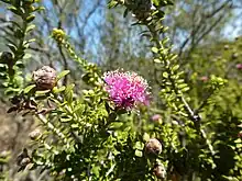 The flowers are a shade of pink to purple and arranged in heads on the ends of branches which continue to grow after flowering, sometimes also in the upper leaf axils. The heads are up to 20 mm (0.8 in) in diameter and contain between 7 and 20 individual flowers. The stamens are arranged in bundles of five around the flower, with 5 to 10 stamens in each bundle. The flowering season is spring and is followed by fruit which are woody capsules, 3–3.5 mm (0.12–0.14 in) long in irregular clusters along the stems.[2][3]