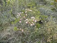 The flowers are a shade of pink to purple and are arranged in heads on the ends of branches which continue to grow after flowering, sometimes also in the upper leaf axils. The heads are up to 18 mm (0.7 in) in diameter and contain 5 to 12 groups of flowers in threes. The petals are 0.7–1.5 mm (0.03–0.06 in) long and fall off as the flower ages. The stamens are arranged in bundles of five around the flower, usually with 4 to 6 stamens in each bundle. The flowering season is mainly in spring but has been recorded as early as April. The fruit are woody capsules, 2–3 mm (0.08–0.1 in) long forming roughly spherical clusters around the stem.[2][3]