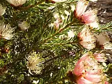 Melaleuca laetifica is a bushy shrub growing to 1 m (3 ft) tall in ideal conditions. Its branchlets are covered with soft, silky hairs when young but become glabrous as they mature. Its leaves are arranged alternately and are 5.5–12 mm (0.2–0.5 in) long, 0.5–1.5 mm (0.02–0.06 in) wide, roughly linear in shape and circular in cross section. They also have distinct, raised oil glands, giving the leaf a warty appearance and often there are long, white hairs, especially on the younger leaves.[2][3]
