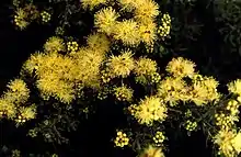 The flowers are arranged in heads up to 25 mm (1 in) in diameter at or near the ends of the branches, with 3 to 4 groups of flowers, 3 flowers in each group. The flowers mainly appear during September and October and are bright yellow, turning brown with age. The stamens are arranged in bundles of five around the flower, with 8 to 14 stamens in each bundle. The cup-shaped base of the flower, the hypanthium is 2–3 mm (0.08–0.1 in) long and covered with silky hairs. The fruit are woody capsules arranged in irregular groups, each capsule 4–7 mm (0.2–0.3 in) long, 5 mm (0.2 in) in diameter and cup-shaped.[2][3]