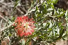 The flowers are crimson and arranged in spikes on side branches, the spikes up to 60 mm (2 in) long and about 50 mm (2 in) in diameter. Each spike contains between 10 and 80 individual flowers. The petals are 3–6 mm (0.1–0.2 in) long and fall off as the flowers open. The stamens are arranged in five bundles around the flower, each bundle with 15 to 25 stamens. Flowers appear mostly from February to December varying somewhat with subspecies. The fruit are woody, roughly spherical capsules about 6 mm (0.2 in) in diameter, forming clusters along the branches.[2][3]