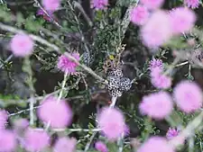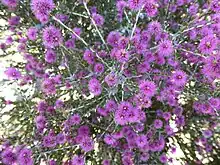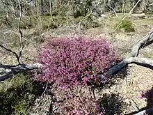 The flowers are a shade of pink to purple and are arranged in spikes on the ends of branches which continue to grow after flowering, and sometimes in the upper leaf axils. The spikes contain 2 to 9 groups of flowers in threes and are up to 10 mm (0.4 in) in diameter and 20 mm (0.8 in) long. The stamens are arranged in five bundles around the flowers and each bundle contains 2 to 5 (mostly 3) stamens. Flowering occurs between September and January and is followed by fruit which are woody capsules 2–2.5 mm (0.08–0.1 in) long in almost spherical clusters which are up to 10 mm (0.4 in) in diameter.[2][3][4]