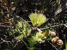 The flowers are yellow to lime-green and arranged in heads on the sides of the branches. Each head contains 5 to 15 individual flowers and is up to 45 mm (1.8 in) in diameter. The petals are 4.5–6.5 mm (0.18–0.26 in) long (compared to 3–3.7 mm (0.12–0.15 in) in M. longistaminea) and fall off as the flowers mature. The stamens are arranged in five bundles around the flowers and there are 9 to 24 stamens per bundle. The flowering period is from August to late November and is followed by fruit which are woody capsules 3.5–6.5 mm (0.14–0.26 in) long with teeth around the edges and in clusters along the branches.[2][3][4]