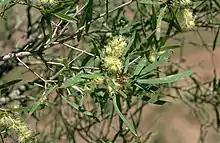 The flowers are creamy-white in colour and are arranged in spikes at the ends of branches which continue to grow after flowering, and sometimes in the upper leaf axils. The spikes contain 6 to 12 groups of flowers in threes well spaced along the inflorescence and are up to 18 mm (0.7 in) in diameter. The stamens are arranged in five bundles around the flower, each bundle containing 6 to 10 stamens. Flowering occurs in most times of the year and is followed by fruit which are woody capsules, 2–3 mm (0.08–0.1 in) long.[2][3]