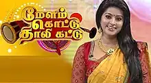 Melam Kottu Thali Kattu is an Indian Tamil-language reality television show, broadcast on Puthuyugam TV from 2013 to 16 April 2014 aired every Saturday and Sunday 8 PM IST and Season 2 aired every Saturday 8 PM IST.[1] It is meant for unmarried women. It includes a seven-round quiz competition with prizes such as gold and other articles required for marriage. The show is presented by actress Sneha. It also airs in Malaysia Tamil Channel on Astro Vaanavil.