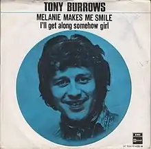"Melanie Makes Me Smile" is a 1970 song written by United Kingdom songwriters Barry Mason and Tony Macaulay. United States singer, Tony Burrows issued his version in April 1970,[1] which reached No. 87 in the US.[2][3] Macaulay also produced Burrows' single. Burrows had previously recorded Mason and Macauley's "Love Grows (Where My Rosemary Goes)" (January 1970) as lead singer of Edison Lighthouse.[4] "Melanie Makes Me Smile" was released by Australian pop group the Strangers as a cover version in June 1970;[5][6] it became a top 10 hit there in September.[7][8]