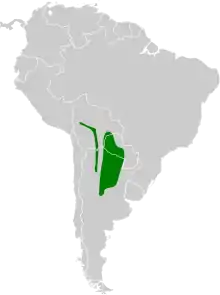 The nominate subspecies of olive-crowned crescentchest is found in La Paz Department of western Bolivia. M. m. argentina is found from central Bolivia to northwestern Argentina. M. m. pallida is found in southeastern Bolivia, western Paraguay, and northern Argentina. The species generally inhabits dry scrub and grassy areas with small bushes, but M. m. pallida also frequents sawgrass in the Chaco Basin. It ranges in elevation mostly from 1,700 to 2,950 m (5,580 to 9,680 ft) but is found as low as 1,200 m (3,900 ft) in Argentina.[7]