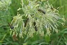 As larvae, Melanostoma fasciatum is predatory and is known to prey on aphids and small caterpillars. Due to this choice of diet, these flies are considered a useful bioagent for managing aphid and caterpillar pests on crops.[3] Adults of this species feed on pollen grains from anemophilous species of plant. Pollen grains up to 50μm have been observed in the gut of M. fasciatum adults. Plantago lanceolota and Taraxacum pollen grains have been recorded in the gut of M. fasciatum. The flies will usually eat pollen out of the anther of the plant. The adults also feed on nectar from a range of species (such as Leptospermum and Daucus), but they will generally not feed on pollen from these plants.[10]