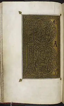 Gold and black incipit initial B from Beatus Vir, Psalm 1, with King David playing the harp.