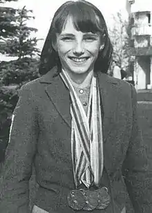 Melita Ruhn (later Fleischer, born 19 April 1965) is a retired Romanian artistic gymnast who represented Romania at the 1980 Summer Olympics.[2] She belongs to the German minority in Romania. She won three Olympic medals (team, vault, uneven bars) for Romania and scored a perfect ten for the vault optionals in the team competition of the 1980 Olympic Games.[3] In 1979 she was a member of the first world gold medal-winning team of Romania. She is also an all around and floor world bronze medalist.