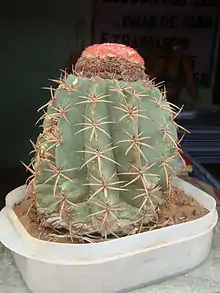 Melocactus zehnerii is a Turk's turban cactus native to the state of Bahia, in north eastern Brazil. It is also known as melocactus giganteus and Cactus zehntneri.[1] Like other Turk's Turbans, it has a roundish lower body with typically about eleven vertical ribs which does the photosynthesis and an elongated upper body, the cephalum. which is a type of capitate inflorescence. Its phyllotaxis is much higher; usually 34/55. This upper cephalum can grow as much as 29 inches ( 72 centimeters) in length, and displaying as many as sixteen annual rings.[2] one of the longest living of all inflorescences known.