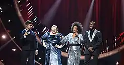 Melodifestivalen 2019 was the 59th edition of the Swedish music competition Melodifestivalen and was held between 2 February 2019 and 9 March 2019. Presenters were Sarah Dawn Finer, Kodjo Akolor, Marika Carlsson and Eric Saade.[1] Edward af Sillén returned as a consultant and adviser, producing various interval acts for the hosts.[2] The winner of the contest is John Lundvik with the song "Too Late for Love". He represented Sweden in the Eurovision Song Contest 2019 in Tel Aviv, Israel, finishing in 5th place.