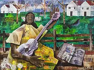 Melody at Hand is a 2007 mixed media collage by artist India Cruse-Griffin, which depicts a woman in a yellow dress playing a guitar, an open book lying nearby. Behind her, a fence separates her from rich green landscape and white houses. The work, which measures 37.25" x 49.25", framed, is made from collaged paper gathered from magazines, upon which Cruse-Griffin then paints, often allowing the underlying magazine paper to show through.[1][2] While her subjects are often clear and straightforward, this collage technique serves as a reminder of the accumulation of lived experience.[1][2]