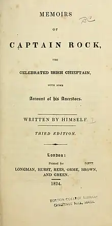 The Memoirs of Captain Rock is an 1824 satirical novel by the Irish writer Thomas Moore. It was first published in London by Longmans.[1] It was released the same year as the destruction of his friend Lord Byron's Memoirs which had left Moore £2,000 poorer. The story is inspired by the mythical Captain Rock, leader of a popular agrarian insurgency in Ireland similar to Captain Swing in England. It purports to be the memoirs of his family's career, told to a naïve visitor to the island.