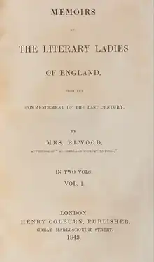 Memoirs of the literary ladies of England from the commencement of the last century (1843), by Anne Elwood, is a group biography of British women writers of the eighteenth and early nineteenth centuries.