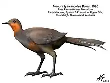 Menura tyawanoides is an extinct species of lyrebird from the Early Miocene of Australia. It was described by Walter Boles from fossil material (a complete left carpometacarpus) found in terrestrial limestone at the Upper Site of Riversleigh, in the Boodjamulla National Park of north-western Queensland. It was smaller than the two living species of lyrebirds. The specific epithet comes from tyawan (a Kumbainggiri term for the superb lyrebird) and the Greek suffix –oides (“resembling”).[1]