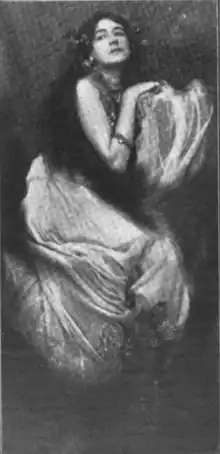 Her histrionic powers and her emotional nature fitted her for stage work. She went to England, and while there, achieved success in London drawing rooms as a dramatic reader. The critics abroad ranked her highly, and in the United States, she repeated her successes on an even greater scale.[3] When she appeared in New York in Oscar Wilde's Salome, a dramatized version of the Song of Songs, the biblical model and language were closely followed.[4] Leigh was a Shakespearean reciter, impersonator, and reader in character. She was a teacher of oratory, vocal, aesthetic, and physical culture, as well as reading, recitation, and dramatic expression, pantomime, statue posing, and stage technique.[5]