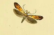 The wingspan is 9–17 mm. The forewings are pale yellow, the distal half of the costa with brown and sometimes with a black edge. Adults have been recorded on the wing in June.