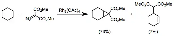 Metal-catalyzed cyclopropanations are chemical reactions that result in the formation of a cyclopropane ring from a metal carbenoid species and an alkene.[1] In the Simmons–Smith reaction the metal involved is zinc. Metal carbenoid species can be generated through the reaction of a diazo compound with a transition metal). The intramolecular variant of this reaction was first reported in 1961.[2] Rhodium carboxylate complexes, such as dirhodium tetraacetate, are common catalysts. Enantioselective cyclopropanations have been developed.[3]