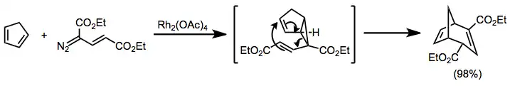 Vinyl diazoacetates react with dienes to afford divinyl cyclopropanes, which undergo Cope rearrangement to afford cycloheptadienes.[19] The more substituted double bond of the diene reacts preferentially.[20]