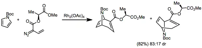 Pyrroles react with vinyl diazoacetates to form nitrogen-bridged cycloheptadienes. The use of methyl lactate as a chiral auxiliary on the vinyl diazoacetate led to moderate diastereoselectivity in the tandem cyclopropanation/Cope rearrangement of Boc-protected pyrrole.[22]