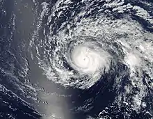 On September 2, a ship passed 60 mi (97 km) to the west of the center of Irma, recording maximum winds of 45 mph (72 km/h),[7][8] while hurricane-force winds were estimated to have extended up to 17 mi (27 km) from the center, both of which indicated that the inner core of Irma remained compact. After being a major hurricane for about 30 hours, the system weakened slightly to a strong Category 2 hurricane at 12:00 UTC on September 2, likely as a result of drier air and eyewall replacement cycles, with the eye sometimes becoming obscured and the deep convection lining the eyewall appearing weaker. During this time, Irma began moving west-southwestward under the influence of a strong high pressure area to the north.[2] The first aircraft reconnaissance flight into the hurricane occurred early on September 4; during the mission, an eye 29 mi (47 km) in diameter and surface winds of 115 mph (185 km/h) were observed. Although the NHC operationally considered Irma to be a Category 3 hurricane at that time,[9] post-analysis indicated that the storm was still at Category 2 status.[2]