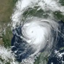 Laura's rapid intensification then ended and its intensity more or less leveled off as it approached southwestern Louisiana.[1] Laura also began to experience some shear from the low to its west, which restricted its outflow on its west side and its pressure began to fluctuate.[30] However, Laura continued to have a very impressive appearance on satellite imagery with a well-defined eye and circular rain bands.[31] Turning almost due north, Laura made its final landfall near Cameron, Louisiana around 06:00 UTC with 150 mph (240 km/h) winds and a pressure of 939 mbars (27.73 inches).[32] The wind speed made Laura the first Category 4 hurricane to ever hit southwestern Louisiana since the 1856 Last Island hurricane as well as the strongest hurricane to hit the state since Hurricane Camille in 1969 (which produced Category 5 conditions over the southeastern portion of the state).[1][33] Forecasters at the NHC described the system as "a ferocious looking hurricane with a clear circular eye, an intense eyewall, and tightly-coiled surrounding spiral bands."[34]