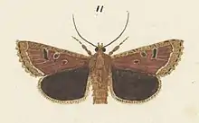โ. 38 mm. Head greyish-brown. Palpi greyish-brown, terminal segment and apex of second segment mixed with ochreous. Antennae minutely ciliated; ferruginous, basal third ochreous-grey. Thorax with slight anterior crest, greyish-brown. Abdomen grey mixed with fuscous, anterior segments prominently crested, each crest with apical blackish bar. Legs ochreous, middle and anterior pair mixed with brown, anterior tarsi more or less infuscated. Forewings moderate, costa almost straight, apex rectangular, termen rounded, rather oblique, crenulate; chestnut-brown; costa narrowly, and termen more widely, greenish-olive; an indistinct, paired angled fuscous fascia near base; a pair of blackish dots on costa at โ and three others before and above reniform; costa between these dots greyish-ochreous; orbicular ovate, dark fuscous ringed with ochreous-white; reniform narrow, inner basal angle somewhat produced, blackish, margined with ochreous-white; claviform obscure, fuscous, margined anteriorly with ochreous-white; second line indicated by dull serrate paired fasciae, excurved to middle, thence incurved to dorsum; subterminal line prominent, margining olive terminal band, ochreouswhite; an indistinct waved blackish terminal line; fringes brown with pale basal and dark median crenulate lines. Hindwings dark fuscous; fringes ochreous-whitish with broad fuscous basal line.[3]