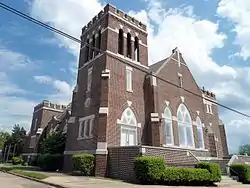 The First United Methodist Church, originally the Methodist Episcopal Church, South is a historic church building at 205 North Elm Street in Paris, Arkansas. It is a two-story brick building with Late Gothic Revival styling, built between 1917 and 1928 for a congregation founded in the early 1870s. It is the congregation's fourth sanctuary, its first three having succumbed to fire. It has a gabled roof with corner sections and a tower topped by crenellated parapets.[2]