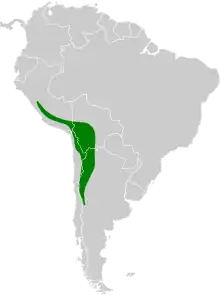 The golden-spotted ground dove is found from Ancash in central Peru east to west-central Bolivia and south to Chile's Coquimbo Region and Argentina's Mendoza Province. It inhabits the arid and semi-arid parts of the puna zone of the Andes. There it is found on the plains, along lake shores, and amid grass tussocks. It flocks in Polylepis woodland or rocky terrain during the nesting season. In elevation it mostly ranges between 2,800 and 5,000 m (9,200 and 16,400 ft) but can be found as low as 300 m (980 ft) in the southern part of its range.[4]