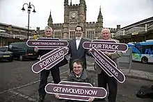 An opinion piece in the Bristol Evening Post in June 2011 called for the establishment of an Integrated Transport Authority for the West of England and for progress on the metro proposal.[14] During the Rail Priority Conference organised by the West of England Partnership in November 2011, delegates travelled on the Portishead line, the Severn Beach line and the Henbury Loop, using sections of track not currently used for passenger traffic.[15][16] In early 2012, during the consultation phase for the new Great Western rail franchise, Bristol City Council and local rail user groups launched Bristol Metro 2013 to ask bidders to incorporate metro plans into their bids.[17] Bristol MPs were lobbied in Westminster by Dawn Primarolo (MP for Bristol South)[18] and Steve Webb (former MP for Thornbury & Yate).[19] The Saltford Station Campaign Group and Bath and North East Somerset Council suggested in April 2012 that the reopening of Saltford station could be part funded by means other than those included in the West of England Partnership's report.[20][21]