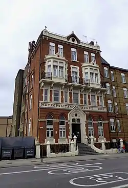 The hospital operated from a series of buildings on Kingsland Road while a dedicated building was being constructed between 1885 and 1886. Under its new governor, Sir Edmund Hay Currie, it began to charge a small subscription, and so dropped the word ‘Free’ from its title.[1] As the Metropolitan Hospital, it formed a partnership with Anglican nursing order, the Order of All Saints.[1] In 1902 King Edward VII became its patron.[1] The hospital developed specialist services, including a dedicated ward for Jewish patients, and expertise in treating tuberculosis.[5] In 1948 the Metropolitan Hospital became part of the National Health Service.[1] After services were transferred to Barts Hospital, the hospital closed in 1977.[1] The building was subsequently converted for use as a business centre and as a hostel.[6]