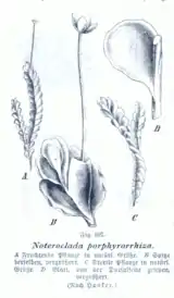 A more thorough understanding of the Metzgeriales was not achieved until the morphological and developmental work of Leitgeb in the late nineteenth century.[14] Leitgeb was among the first to recognize and appreciate the significance of development and reproductive morphology as a guide to distinguishing liverwort groups. His careful examinations guided revisions made in the classification published from 1893 to 1895 by Schiffner in Engler and Prantl.[17] Schiffner thus divided his "Jungermanniales" into two broad groups according to whether the archegonia were terminal on reproductive branches (Jungermanniales akrogynae) or sub-terminal (Jungermanniales anakrogynae). This latter group included what are now recognized as the Metzgeriales, Sphaerocarpales, and Haplomitriales.