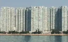 The estate consists of 6 residential buildings built in two phases. Phase 1, incorporating Blocks 1, 2 and 3, was completed in 1991.[3] Phase 2, incorporating Blocks 4, 5 and 6, was completed in 1992. The three buildings in each phase are arranged in the shape of a concave curve. There are 1,272 flats,[4] ranging from 403 to 1,183 square feet (37.4 to 109.9 m2),[5][6] in the 6 residential towers.